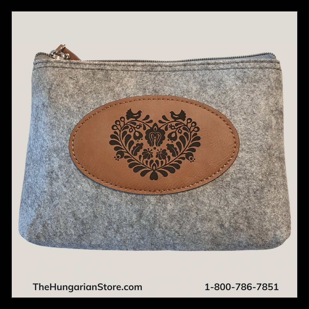 A charming zipper felt bag laser engraved with a Hungarian folk are theme. 6”x 8”.