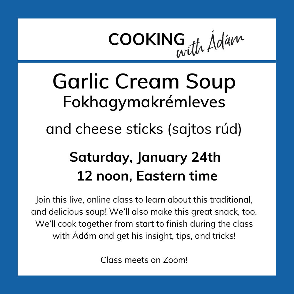 We will learn how to make delicious garlic soup as well as cheese sticks — a delightful appetizer! We will send the ingredient list and the Zoom link once you are registered.